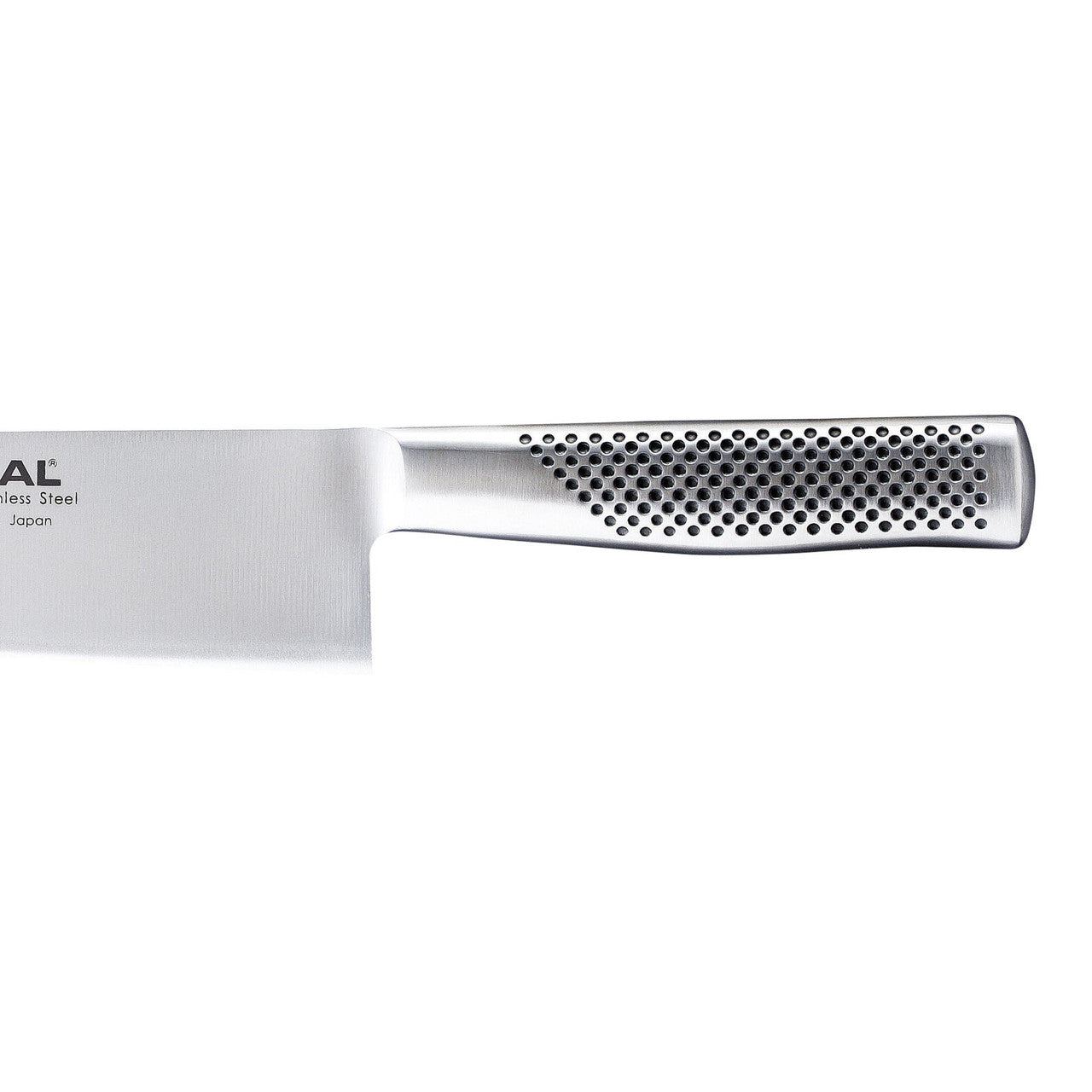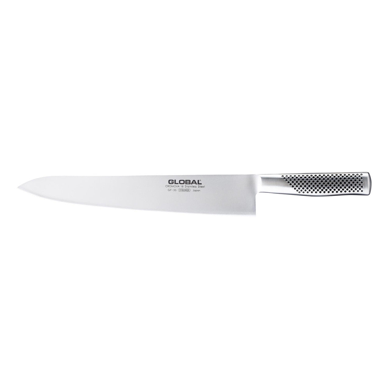 The GF-35 is made from forged CROMOVA 18 stainless steel, specially developed by GLOBAL as it holds a razor-sharp edge and resists rust, stains and corrosion. Ice tempered and hardened to Rockwell C56-58, each knife is carefully weighted by filling the handles with sand to achieve the optimum weight and perfect balance. Other unique features include its smooth contours and seamless construction which eliminates food and dirt traps offering the ultimate in safety and hygiene. The acute 15-degree angle cutting edge provides unsurpassed performance and superior edge retention.