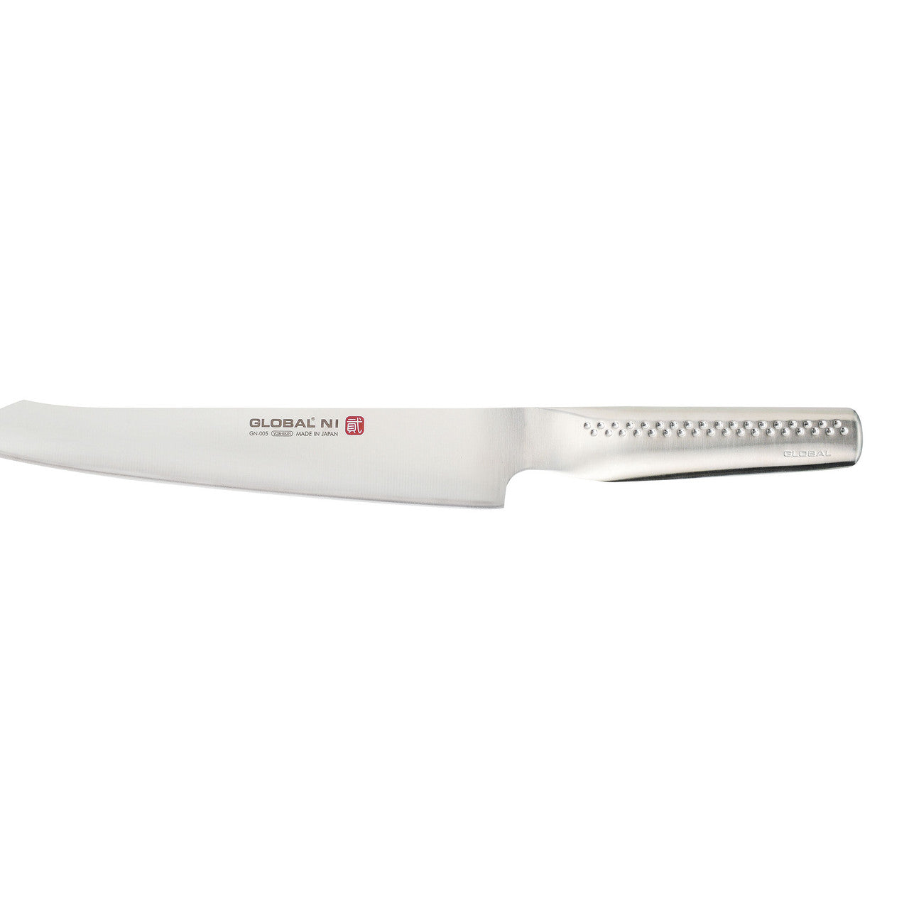 GLOBAL NI knives all feature an oriental styling, with a distinctive kink in the knife blade. The blades are sharpened at a 15-degree angle, to provide an extremely sharp edge and go through an extra sharpening process in the factory.