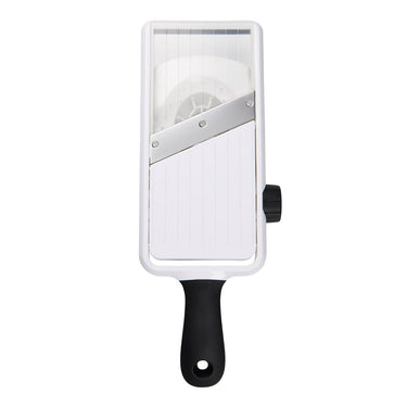 The OXO Good Grips Adjustable Handheld Mandoline Slicer features 3 thickness options: 1mm, 2.5mm and 4mm. The included food holder and stainless steel blade make even slices, every time. A clear surface shows slices accumulating below and the wide ramp accommodates a variety of vegetables. Non-slip notches allow for slicing directly over bowls. Dishwasher safe.