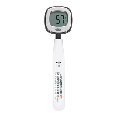 The OXO Good Grips Digital Instant Read Thermometer delivers fast, reliable temperature readings with an easy-to-read digital display. The long stainless steel probe quickly reaches deep into meat, poultry, soups and liquids, giving you precise readings in both °C and °F. It’s perfect for grilling, baking and candy-making, and features an automatic shut-off to preserve battery life.