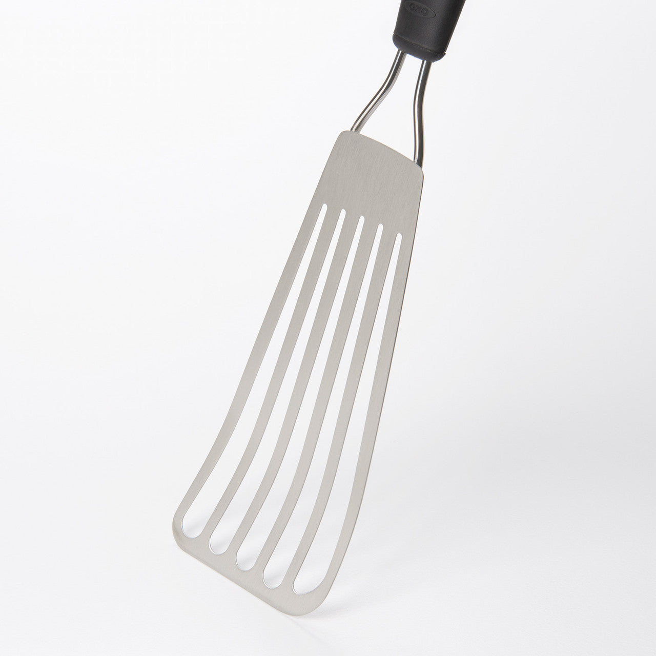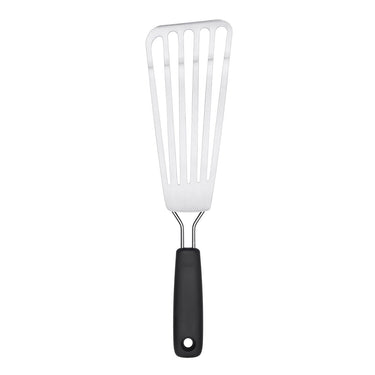 The OXO Good Grips Fish Turner is designed to gently slide under fish fillets and other delicate foods without scratching cookware. Its thin, flexible head lifts with precision, while the soft, comfortable non-slip handle provides secure control. A convenient hanging hole makes storage simple.