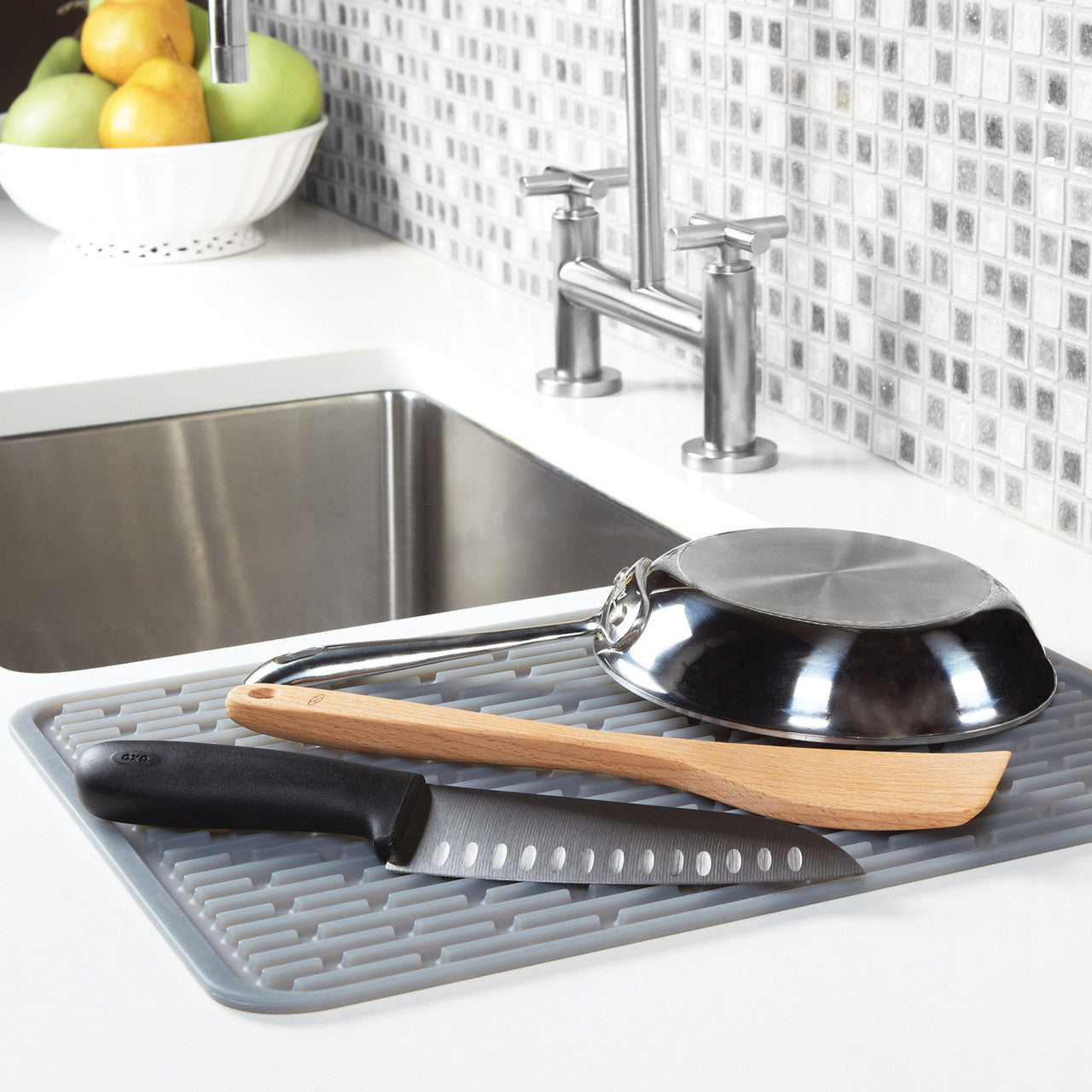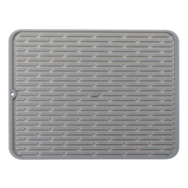 The OXO Good Grips Drying Mat – Large makes hand-drying dishes quicker and more efficient with its unique ribbed design that elevates and aerates items for better drainage. Made from flexible, food-safe silicone, it protects delicate glasses and cookware while speeding up the drying process. When not in use, the mat rolls up for compact storage or can be hung to dry.
