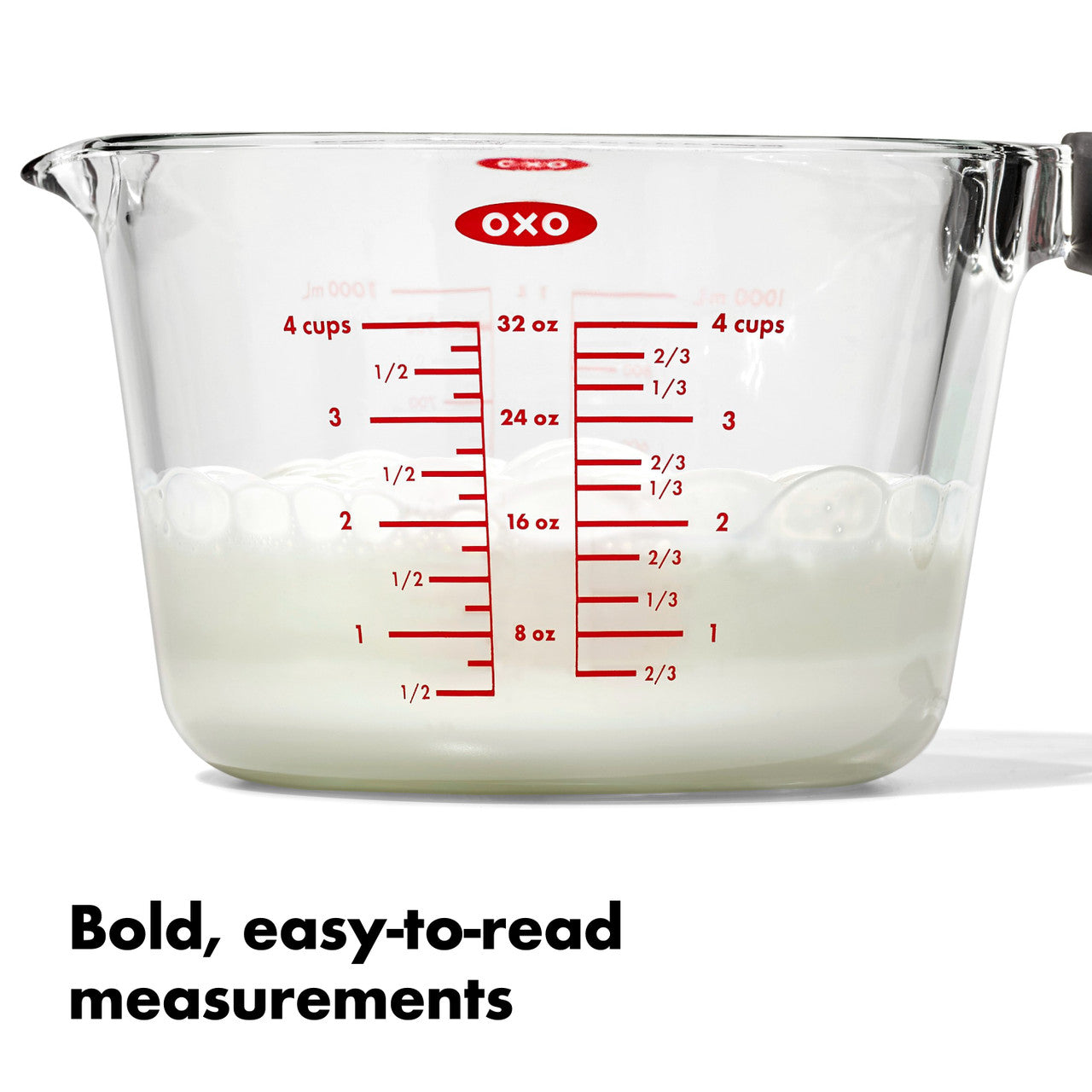 We’ve made measuring, pouring, storing, heating and reheating liquids even easier with the OXO Good Grips 4-Cup Glass Measuring Cup.