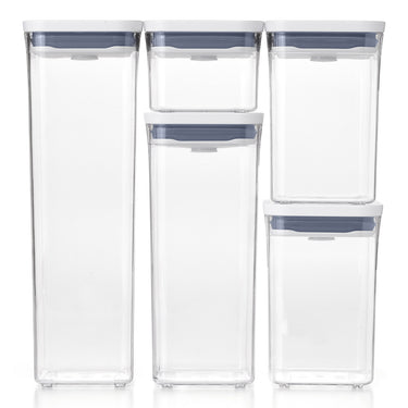 The OXO Good Grips POP 2.0 5-Piece Set is the key to keeping pantry staples fresh and kitchens organised. Airtight, stackable, space-efficient, and now completely dishwasher safe, these containers can be customized to fit any space. New shapes and sizes provide new possibilities for storing everyday must-haves like flour, sugar, coffee, cereal, oatmeal, grains, pasta and spices. With a handy fill line to guide you, curved corners for smooth dispensing and sturdy, BPA-free construction, POP containers take tidying to the next level. POP Containers aren’t just for kitchens: use them anywhere you want more organisation. Set includes one 2.1 L container, one 1.6 L container, two 1.0 L containers, and one 400 ml container. POP lids feature push-button airtight seals that double as handles.