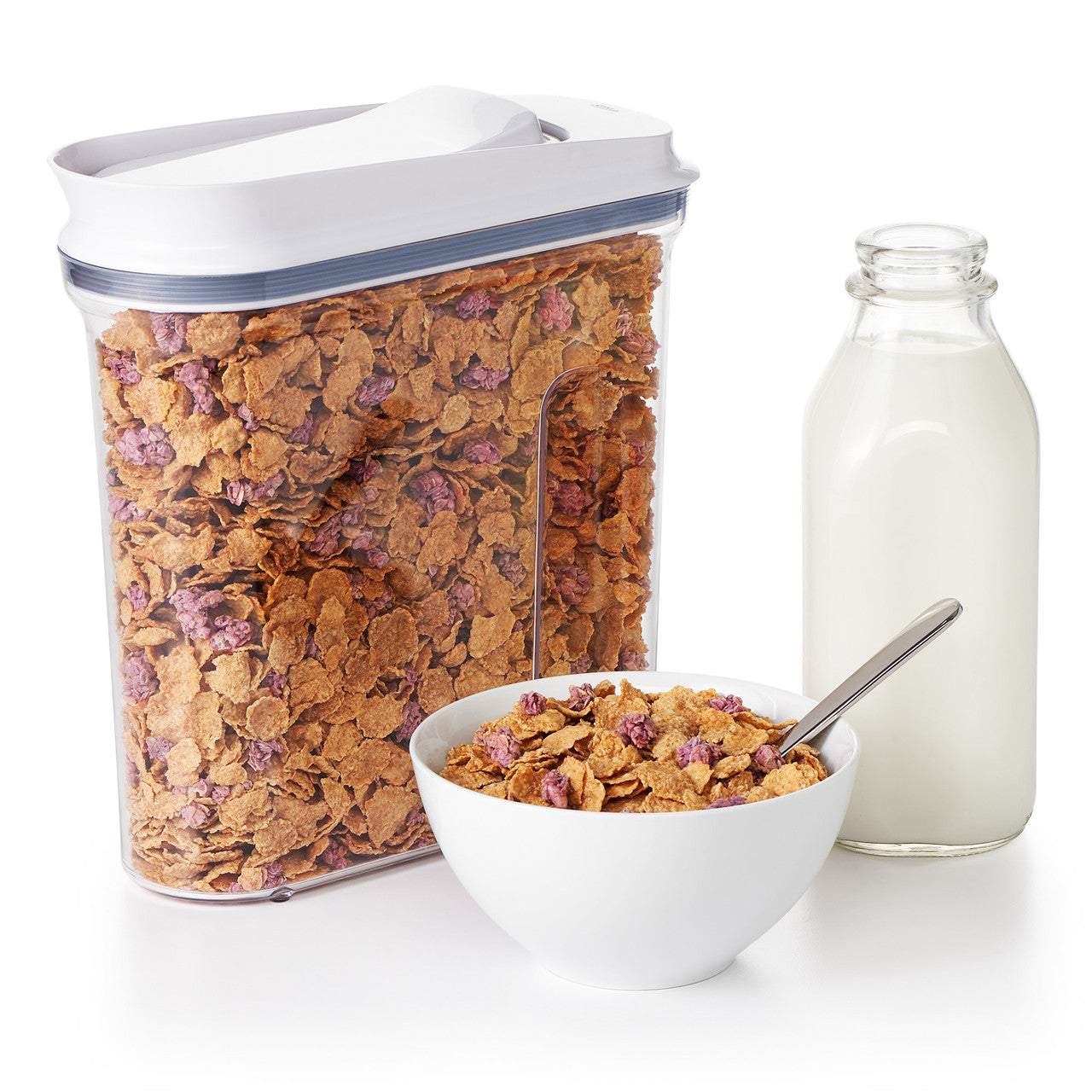 Our POP Cereal Dispensers feature pop-open lids for one-handed opening and closing. The smooth-pour spout is designed to prevent messy spills. Contoured for a comfortable hold, even when full, and shaped for efficient storage on countertops or in cabinets.