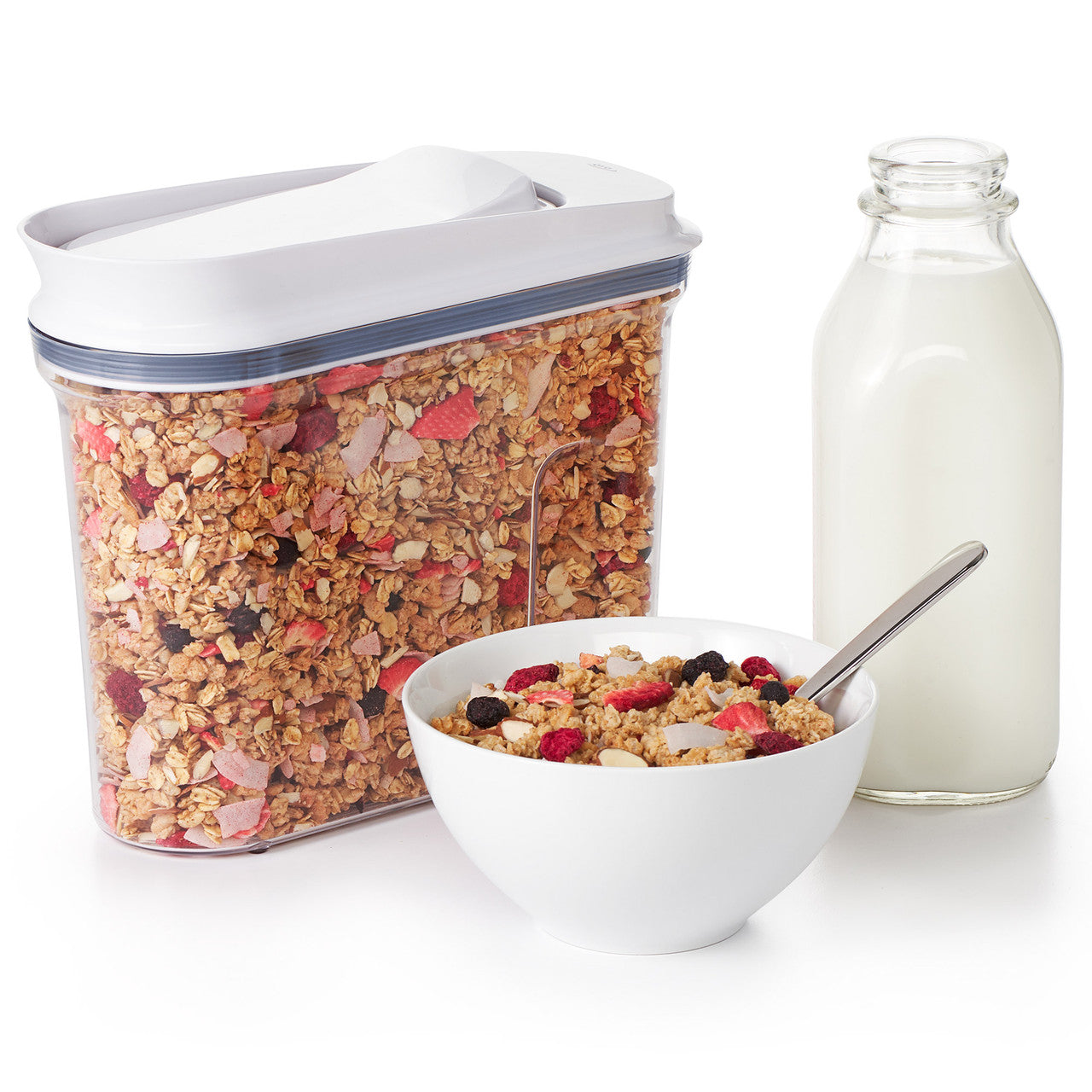 Our POP Cereal Dispensers feature pop-open lids for one-handed opening and closing. The smooth-pour spout is designed to prevent messy spills. Contoured for a comfortable hold, even when full, the shape is efficient for storage on countertops or in cabinets.