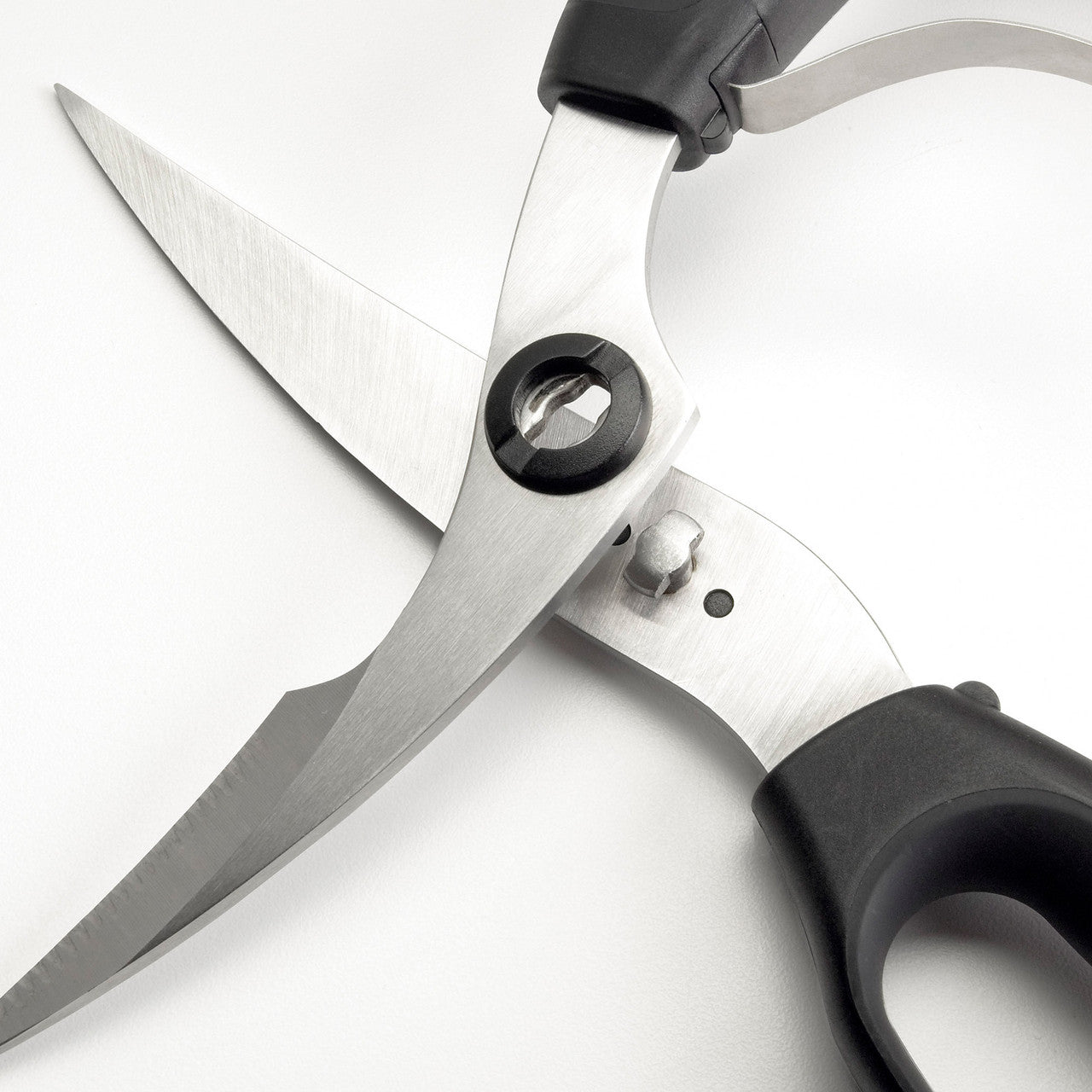 With the OXO Good Grips Poultry Shears in hand, it’s never been easier to prep a whole chicken or turkey for cooking. The unique, curved blades allow you to reach deep into tricky crevices, while the notch holds bones in place for precision cuts. Micro-serrated, stainless steel blades slice easily through any ingredient, from herbs and veggies to pork and poultry. Trim fat, cut through woody stems and more—the spring-loaded handle prevents strain as you work, so you can cut large tasks down to size.