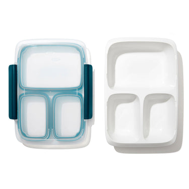 The OXO Good Grips Prep & Go Divided Container – 0.9 L is a versatile and leakproof solution for lunching, meal prep and on-the-go eating. Designed with two separate compartments, it keeps ingredients like proteins and veggies, soups and salads, or any meal components neatly separate until you’re ready to eat. The watertight lid features silicone gaskets and dual locking clips that help contain liquids and prevent spills, while stay-cool handles make it easy to transport from microwave to table.