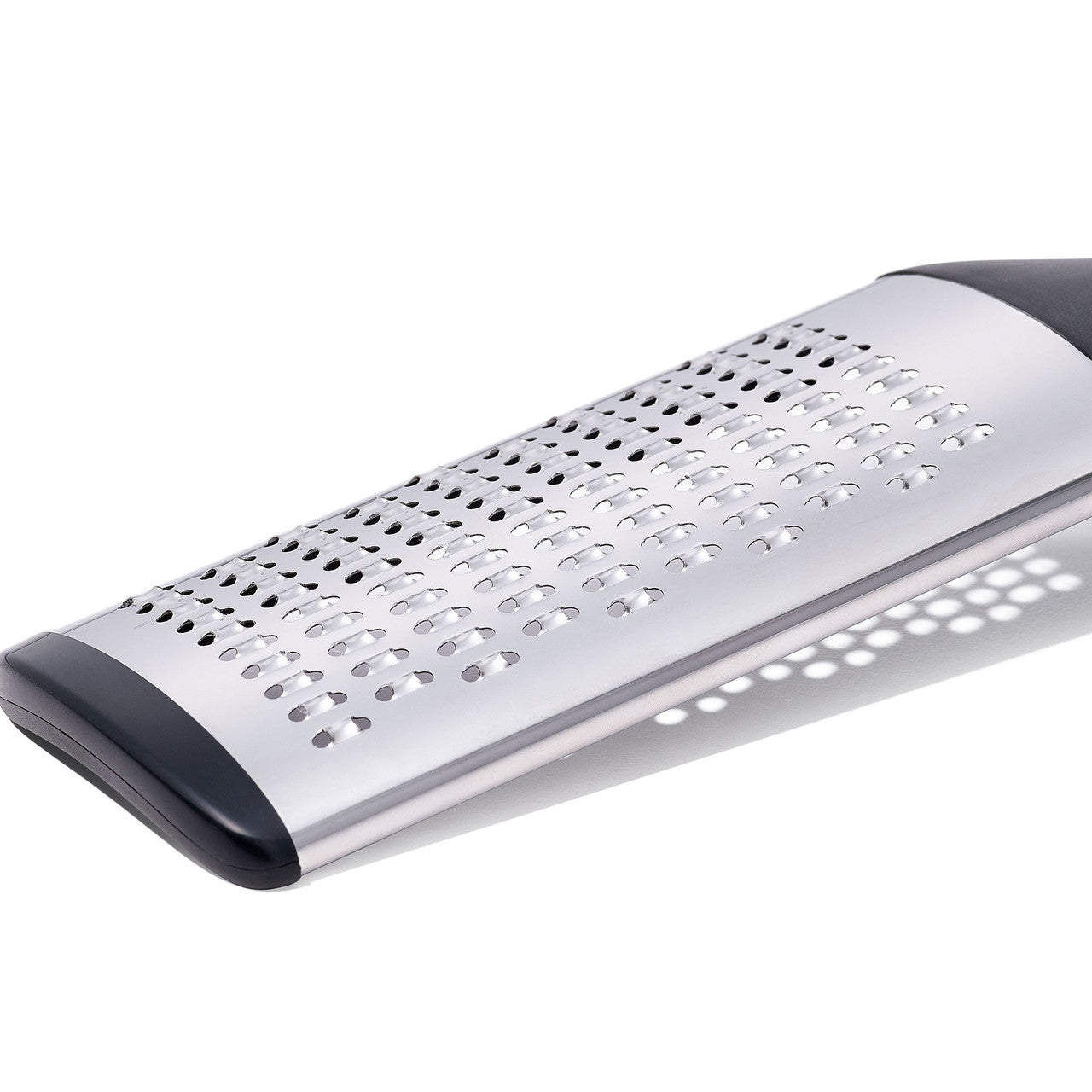 The OXO Good Grips Grater is an essential tool for hard cheese, chocolate, carrots, zucchini and more. The Grater’s bi-directional stainless steel surface helps you tackle any grating task quickly and easily, while its soft, comfortable, non-slip handle provides a secure grip and cushions your hand during repetitive use. A non-slip foot keeps the Grater steady on any surface when in use, and the Grater is dishwasher safe for easy cleaning.