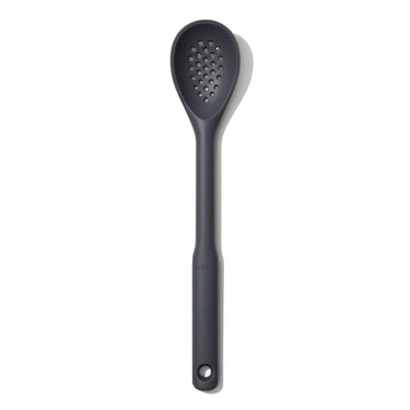 The OXO Good Grips Silicone Slotted Spoon lets you lift and serve foods while allowing liquids to drain easily. Its soft, flexible silicone head is safe for use on non-stick cookware and glides through soups, sauces and stews with ease. The comfortable, non-slip handle provides secure control, and the hanging hole makes storage simple.