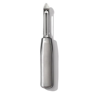 Need to peel a bushel of apples? Or a few pounds of potatoes? The OXO Steel Swivel Peeler can make quick work of the task. One of our most iconic tools, the Peeler features a sharp, Japanese stainless steel blade, which swivels to glide effortlessly around firm fruits and vegetables. The blade digs under skin but leaves all the good stuff underneath intact. There’s also a built-in eyer to remove imperfections in a single scoop. And the sleek handle gives a pro-level look while also providing a comfortable grip.