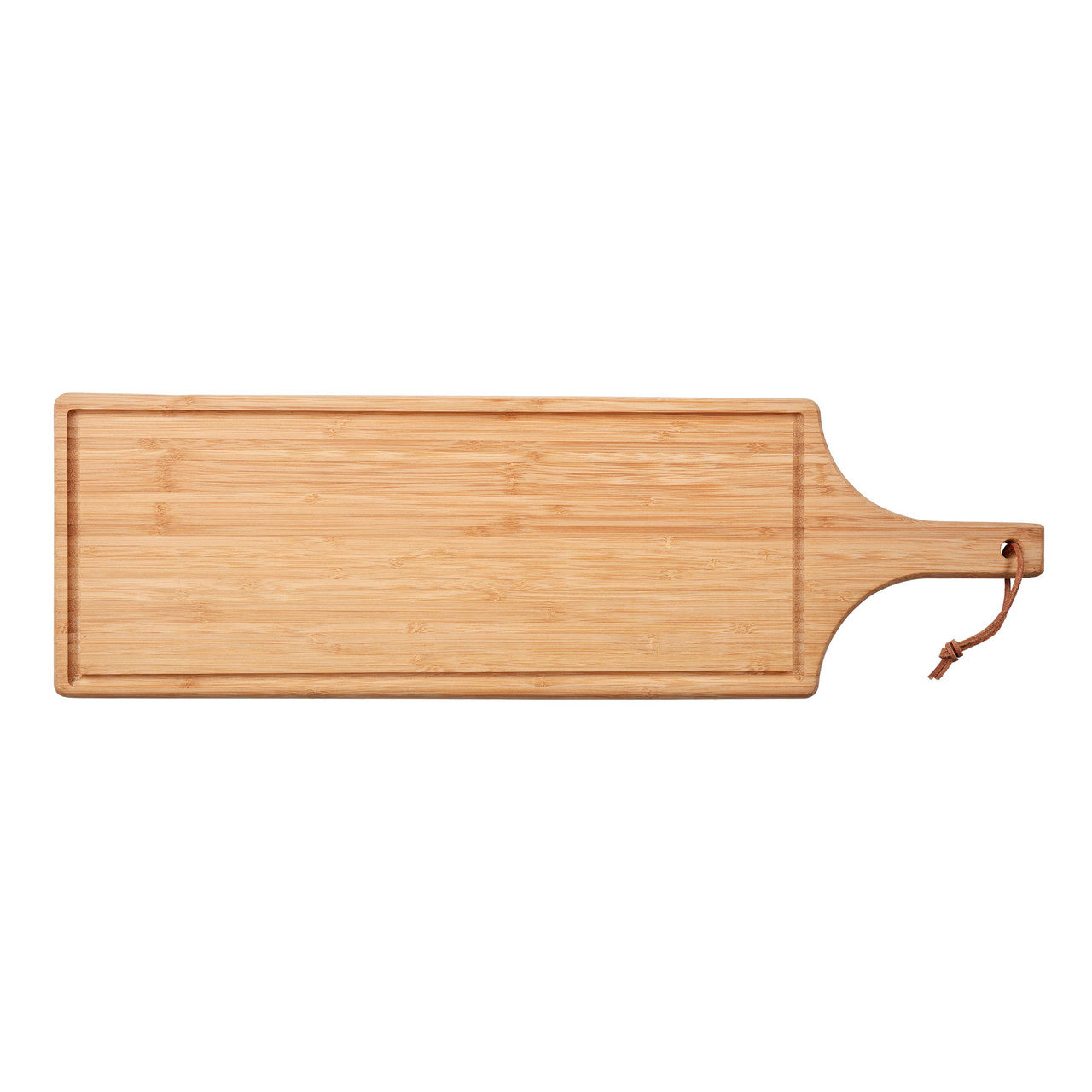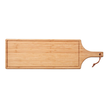 This oil treated, 1.8.cm thick functional bamboo board is elegant and can be used on both sides, one plain for serving and the other with a deep juice groove.