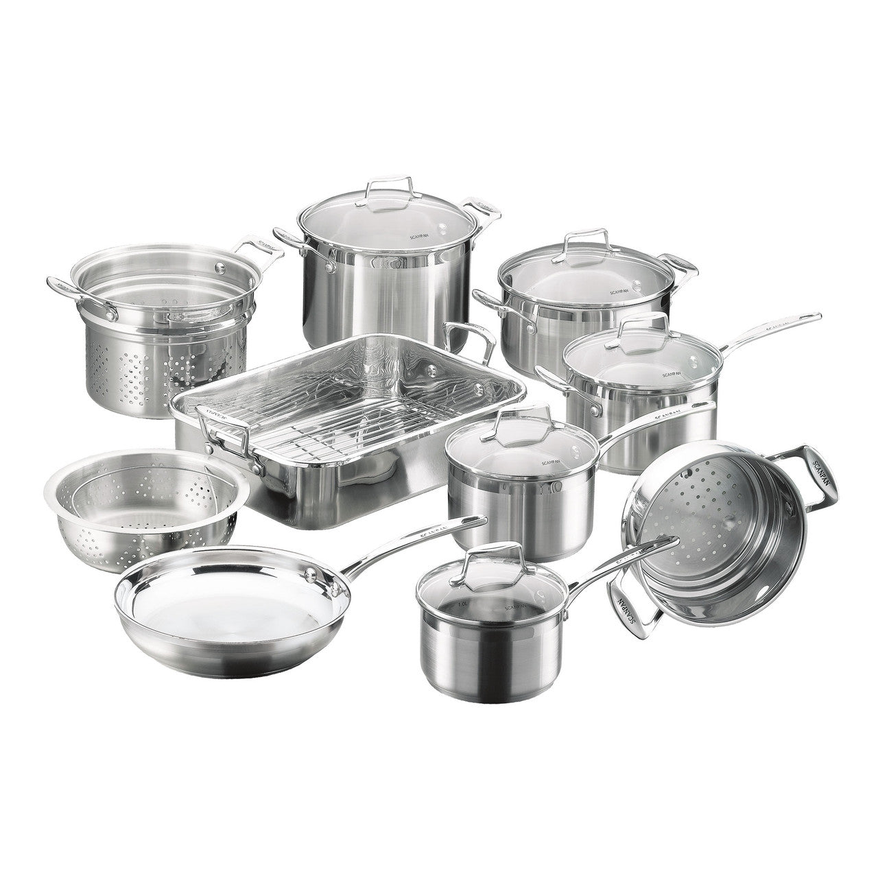 10 Piece Set includes: 26cm fry pan, 24cm/4.8L dutch oven, 16cm/1.8L, 18cm/2.5 and 20cm/3.5L saucepans,steamer insert to fit 16/18/20cm, 35cm x 24cm roaster with rack, 24cm/7.2L multi pot set wth - 24cm/7L stock pot, 24cm steamer insert and 24cm pasta insert