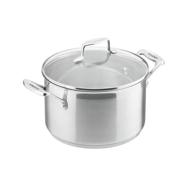 With many years of experience, SCANPAN's Danish designers have developed the popular stainless steel Impact range with all the features you would expect from SCANPAN. This 22cm/4.5L Dutch Oven is ideal for small family meals and has a stylish two tone matt/polished appearance with a glass lid to enable easy viewing of your cooking in progress. The optimal 6.4mm thick bonded sandwich base ensures optimal heat distribution. Compatible with all energy sources including induction, this range is as wide as it is popular. The rim design allows for drip-free pouring and the handles are secured with heavy duty rivets. The contemporary satin finish suits all kitchen decor and with the internal capacity markings on a polished internal finish making measurement easy and accurate.