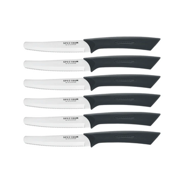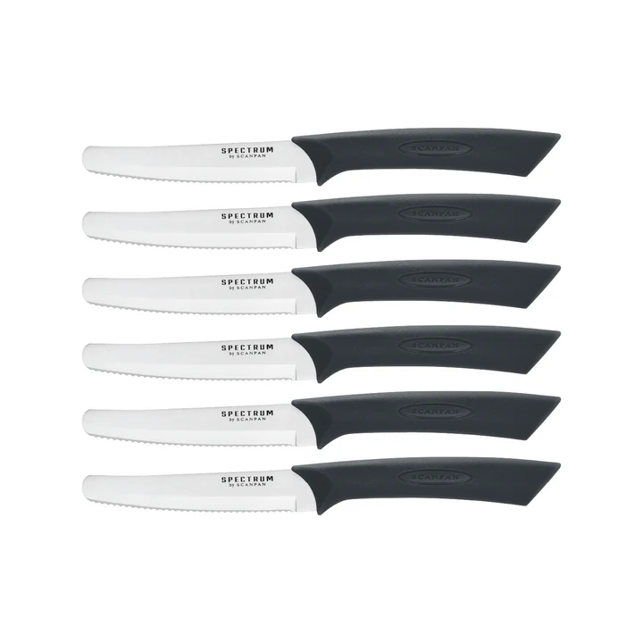 The Spectrum by SCANPAN 6pc Steak Knife Set is the new, upgraded version of the popular Spectrum series. Made from high-carbon stainless steel, each knife features a superior serrated edge that allows for effortless slicing through steak and other meats.